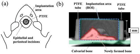 New bone formation was evaluated using μ-CT and histological evaluation. First, new bone formation into the PTFE was observed using a micro focus X-ray system (inspeXio SMX–225CT, SHIMADZU Corp., Kyoto, Japan) at 140 kV × 70 μA. The imaging conditions were 1024 × 1024 pixels, 1200 views, slice thickness 0.077 mm, and interslice distance 0.047 mm. Software (TRI/3D–BON–FCS64, ver. R.10.01.00.1-H-64, RATOC System Engineering Co., Ltd., Tokyo, Japan) was used to construct and analyze three-dimensional (3D) images of the obtained tomographic images. After μ-CT observation, the bone mineral density (BMD) value in the ROI (region of interest) inside the PTFE tube, as shown in Figure 1, was measured using CT values. As previously reported, ranges with a brightness similar to the CT value of the calvarial bone were defined as new bone [].