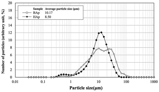 The particle size distribution and average size of BAp and HAp are shown in Figure 3. The average particle size was 10.17 μm for BAp and 8.50 μm for HAp. HAp exhibited a slightly lower value than that of BAp. However, particle size distribution was wider for BAp than for HAp. This indicates that there was a greater variation in the particle size of BAp.
