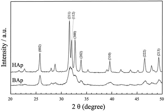 The XRD patterns of the apatite derived from BAp and HAp are shown in Figure 4. The phase compositions of BAp and HAp were characterized using X-ray diffraction. For HAp, sharp peaks of apatite could be observed at approximately 25.80°, 31.76°, 32.26°, 32.83°, 34.00°, 39.80°, 46.70°, and 49.50° for 2θ corresponding to (002), (211), (112), (300), (202), (310), (222), and (213) planes of hydroxyapatite. In BAp, broad apatite peaks were observed at the same positions as those in the diffraction peaks of HAp, at approximately 2θ = 26 and 32–33°. Thus, BAp was identified as less crystalline than HAp owing to its lower peak intensity.