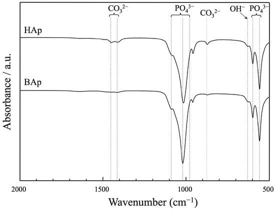 The FTIR spectra of apatite derived from BAp and HAp are shown in Figure 5. The bands at 633 cm−1 are characteristic of the hydroxyl group in the hydroxyapatite. The peaks at approximately 571, 602 cm−1, and 956, 1042, and 1096 cm−1 were assigned as phosphate groups of apatite. The peaks derived from carbonate ions were recognized at approximately 880, 1426, and 1457 cm−1 for both BAp and HAp. The carbonate content was lower in BAp than that in HAp because of the weaker peak intensity of the carbonate groups.