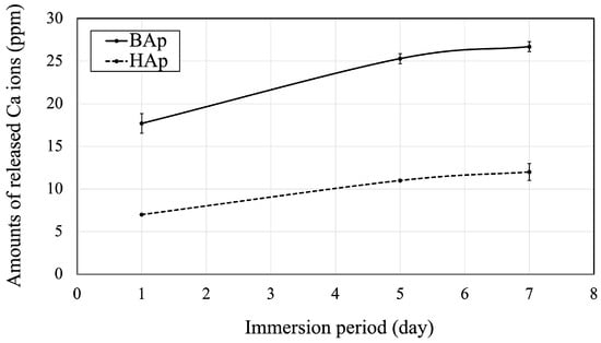 The amounts of released Ca ions from BAp or HAp are shown in Figure 6. The amount of Ca released from BAp after 1, 5, and 7 days of immersion was significantly higher than that from HAp (p < 0.05).