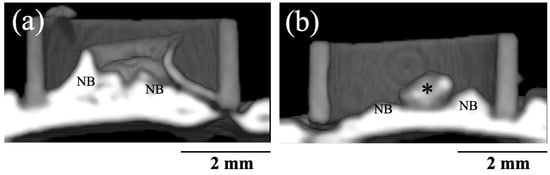 Three-dimensional CT images of new bone formations into PTFE tubes by implantation of BAp and HAp paste 8 weeks after surgery. (a) BAp paste, (b) HAp paste. NB: Newly formed bone, Asterisk: residual apatite.