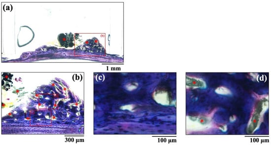The histological images of new bone formation in the PTFE tubes by implantation of HAp paste 8 weeks after surgery. (b) Higher magnification images of the boxed area in (a). (c,d) Further higher-magnification images of the boxed areas of (b), respectively. NB: Newly formed bone, Asterisk: residual apatite.