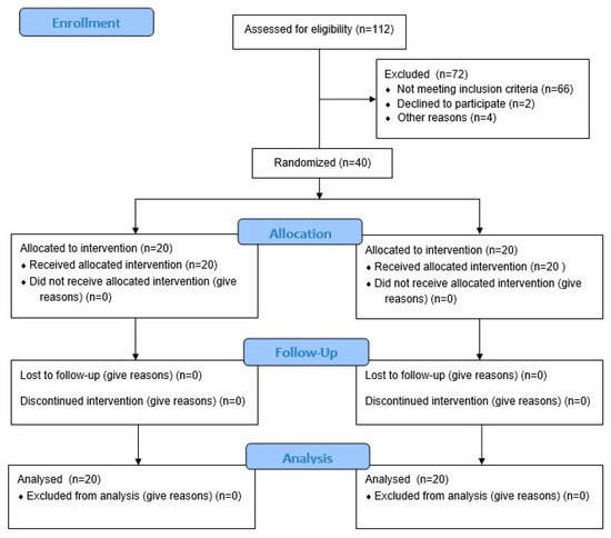 The primary study outcome was the change in the CAL. The sample size was calculated from the research results obtained by Vukovic et al. [54] to detect a clinically significant difference of 0.5 mm in the CAL between the two therapeutic procedures. In order to achieve a study power of 80%, with an α error of 0.05, assuming that the standard deviation (SD) was 0.44 mm, a required sample size of 19 patients per group was calculated. To account for a 5% dropout that could occur during the course of the study, 40 patients seeking periodontal therapy were considered for recruitment. Screening continued until a total of 40 patients (20 per group) were enrolled (Figure 1).