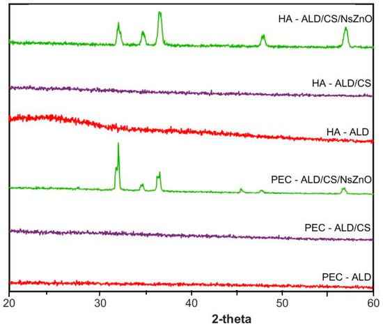 - The X-ray diffraction (XRD) patterns (Figure 3) of HA-ALD and PEC-ALD are amorphous, and the gels formed from these components in the absence of NsZnO are correspondingly amorphous [56]. The XRD patterns of the bionanocomposite hydrogels containing NsZnO have peaks corresponding to NsZnO that are in agreement with our previously reported data [57], with clear evidence of a crystalline hexagonal phase with a wurtzite structure: the five main reflection peaks (100), (002), (101), (102) and (110) are consistent with those of the standard card for the hexagonal phase ZnO (JCPDS ICDD 36e1451). The inclusion of the NsZnO nanoparticles in the gels is clearly evident from the presence of the wurtzitic NsZnO XRD patterns in the bionanocomposite hydrogels. The preservation of the wurtzitic ZnO crystalline structure after the dispersion of the nanoparticles in the gel matrix is significant because of the link between structure and function [41]. Importantly, scanning electron microscopy (SEM) and energy-dispersive X-ray spectroscopy (EDS) confirmed the homogeneous dispersion of the NsZnO particles inside the polymeric matrix (Figure A2). This is of interest for the antibacterial activity of these biomaterials, as the reproducibility of the diffusion of Zn2+ will be dependent upon the homogeneity of dispersion within the gel matrix.