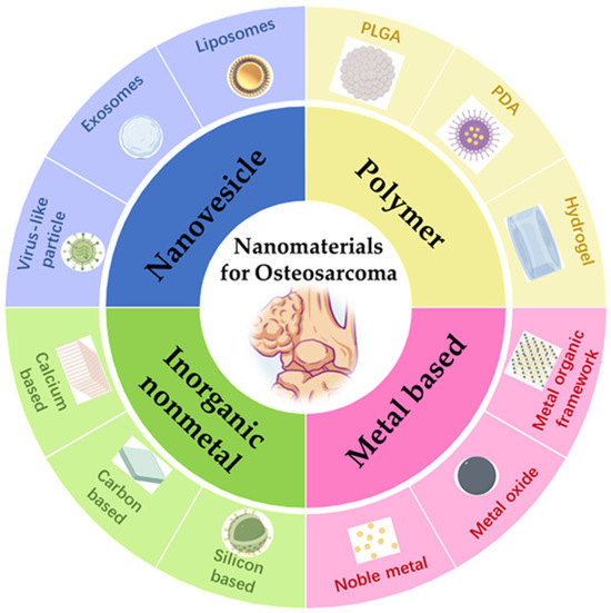 Osteosarcoma (OS), a prevalent primary malignant bone tumor in children and adolescents, has maintained consistent treatment protocols since the 1970s combining surgery, chemotherapy, and radiotherapy. While effective for localized tumors, these strategies show limited efficacy against metastatic or recurrent cases. Although emerging immunotherapies (PD-1 inhibitors, CAR-T-cell therapy) demonstrate therapeutic potential, their clinical impact remains constrained by the tumor’s low immunogenicity and immunosuppressive microenvironment, resulting in suboptimal response rates. The disease’s aggressive nature and propensity for pulmonary metastasis contribute to poor prognosis, with survival rates showing negligible improvement over five decades despite therapeutic advances, creating substantial clinical and socioeconomic challenges. Recent developments in nanomedicine offer promising solutions for OS treatment optimization. This review systematically examines nanomaterial applications in OS therapy through a materials science lens, analyzing mechanism-specific interventions and highlighting notable advancements from the past five years. We critically evaluate current strategies for enhancing therapeutic efficacy while reducing toxicity profiles, ultimately outlining translational pathways and key challenges in clinical adaptation. The analysis establishes a framework for developing next-generation nanotherapeutic platforms to address persistent limitations in OS management.