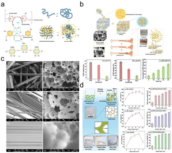(a) Proposed schematic representation of curcumin delivery from PAA/SA/CMC/PS/CUR hydrogel. * means hydrogen bonding. (b) Curcumin release from the double-network hydrogel loading CRF, CF, and GLF scaffolds. Experiments were performed in triplicate at pH 5.0 and 7.4. (c) SEM images of fiber-reinforced scaffolds. (d) Wet foam characterization. Adapted with permission from Ref. [13]. Copyright 2025 Elsevier.