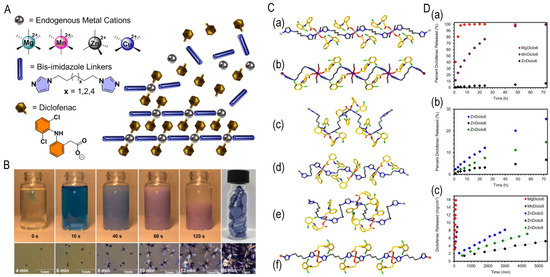 (A) Components of TCPs (MDicloX): M = Mg2+, Mn2+, Zn2+, or Cu2+ metal cations. Diclo = diclofenac anions, and X = bisimidazole linkers with total carbon chain lengths of 5, 6, or 8 between imidazoles. Representation of drug release from TCPs via degradation of metal–ligand interactions. (B) Rapid synthesis of TCP CuDiclo6 upon addition of Cu(NO3)2 in MeOH with pressed monoliths depicted and formation of large single crystals at lower concentration in MeOH. (C) Single-crystal structures of TCPs: (a) MgDiclo6, (b) MnDiclo6, (c) ZnDiclo5, (d) ZnDiclo6, (e) ZnDiclo8, and (f) CuDiclo6. Mg = light grey, Mn = purple, Zn = grey, Cu = orange, N = blue, O = red, Cl = green; bisimidazole and diclofenac C-atoms are shown in silver and gold, respectively. (D) Drug release profiles from 5 mm TCP monoliths in 0.05 M phosphate buffer, pH 6.8 at 37 °C. (a) MgDiclo6 (red), MnDiclo6 (purple), and ZnDiclo6 (black) demonstrate effect of varying metal ion composition, (b) ZnDiclo5 (blue), ZnDiclo6 (black), and ZnDiclo8 (green) demonstrate effect of varying linker composition, (c) intrinsic dissolution release (IDR) rates of diclofenac from TCPs measured using a Woods apparatus, demonstrating prolonged zero-order release kinetics. Adapted from Ref. [19].