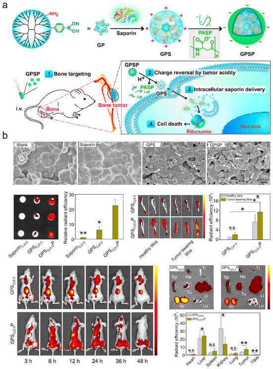 (a) Design of bone-targeted protein nanomedicine for the treatment of malignant bone tumors. (b) Bone-targeting capability of GPSP. The white arrows indicate GPS or GPSP nanoparticles adsorbed on the hydroxyapatite tablets. (* p < 0.05 and ** p < 0.01 analyzed by student’s t-test, N.S. means no significance, one tailed). Adapted from Ref. [23].