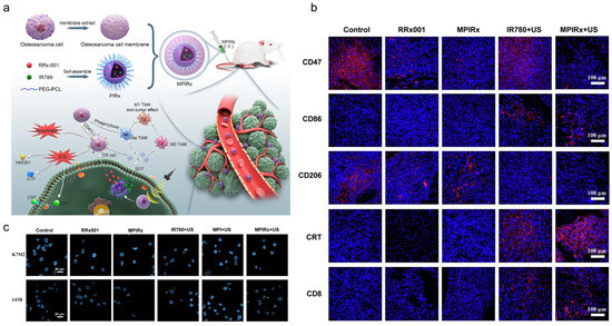 (a) Construction of MPIRx nanodrugs for CD47 immune-checkpoint/sonodynamic therapy of OS and pulmonary metastasis. (b) Representative immunofluorescence images of tumor sections by different treatments showing CD47, CD86, CD206, and CRT expression. (c) Effect of MPIRx nanodrugs on ICD of OS cells. Calreticulin on the outer surface of OS cells was imaged by LSCM. Adapted with permission from Ref. [32]. Copyright 2023 Elsevier.