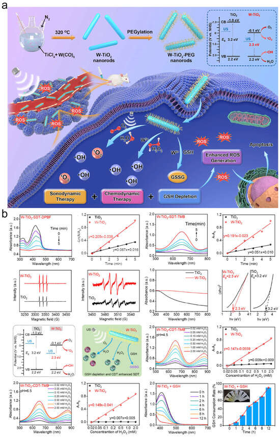 External stimuli (e.g., light, heat, ultrasound) further amplify catalytic efficiency: NIR-II-driven FeS@CP NPs accelerate •OH generation and GSH depletion under irradiation, enabling synergistic photothermal/chemodynamic therapy [39]. Geng et al. synthesized W-doped TiO2 nanorods via high-temperature solution methods, where W5+/W6+ doping enhanced ROS generation for ultrasound-activated tumor ablation with rapid renal clearance (Figure 7) [43].
