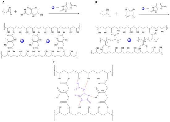 Esterification reactions between PVA and CA (A), PVA and PAA (B) and electrostatic intermolecular interactions between PVA:CA crosslinked matrix and allantoin (C).