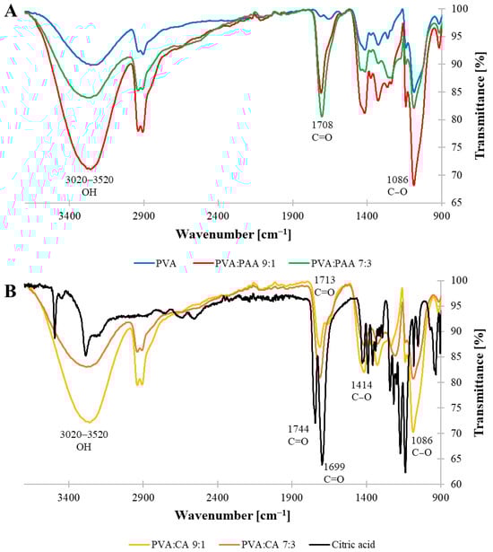 Crosslinked thin films were prepared by pouring the coating formulations into silicon mold (2 × 2 cm2), followed by drying at RT for 1–2 days. Subsequently, the films were thermally cured at 130 °C for 2 h (for the PVA:CA formulations) and at 140 °C for 40 min (for the PVA:PAA formulations).