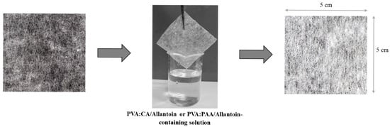 Polyethylene nonwoven fabrics (5 × 5 cm2) were immersed in aqueous solutions of PVA:CA/allantoin or PVA:PAA/allantoin for 5 s. The coated fabrics were dried at room temperature overnight, followed by thermal curing as described above.