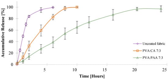 It has been shown that the sustained release of hydrophilic reagents from fabrics for several hours and even can be realized by polymer coatings with high crosslinking density and thickness, such as hydrogels based on alginate/poly(ethylene glycol) diacrylate/poly(N-isopropylacrylamide) [27], chitosan/salicylaldehyde/silver nanoparticles [28], wax [29], and electrospun nanofibers [30]. However, such systems are relatively rare and there is a strong need for developing new biocompatible coating formulations containing a balanced crosslinking density, thickness, and extensive intermolecular interactions that allow sustaining the release of hydrophilic carriers.