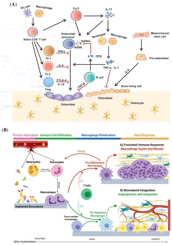means inhibition). Reprinted from Ref. [11]. (B) The local immune–bone–biomaterial microenvironment. Reprinted with permission from Ref. [14]. Copyright 2020, John Wiley and Sons.
