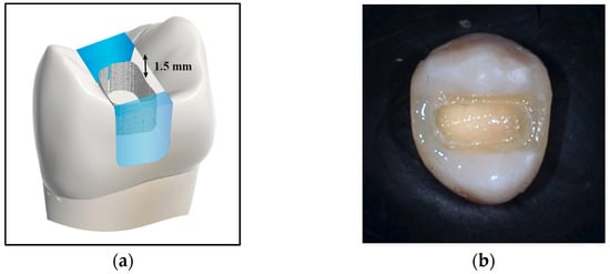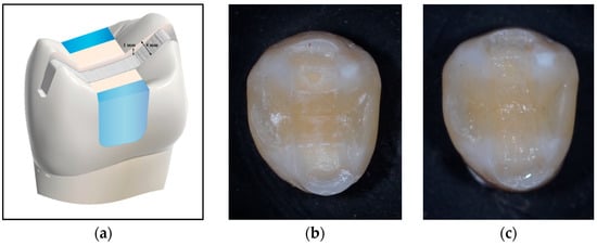 Deep and wide MOD cavities in maxillary premolars were prepared in five of the six groups by a single operator to simulate extensive cavities. To standardize the cavity dimensions, a digital caliper (Tooleye, Germany), and a 15 UNC graduated periodontal probe (Hu-Friedy, Chicago, IL, USA) were used. The outline was positioned at the occlusal surface’s midline, centered between the inter-cuspal distance. A round-end parallel diamond bur (881.31.014 FG-Brasseler Dent, Savannah, GA, USA) was used in a high-speed handpiece (NSK PanaAir FX, Kanuma, Japan) to prepare the cavity. The diamond bur was replaced with a new one after every five preparations. A digital caliper was used to continuously measure the thickness of the walls at the cavity base [24]. The cavity dimensions were standardized with a depth of 5 mm [26,27] and a width of 2/3 the inter-cuspal distance (approximately 4 mm) [28]. The walls of the cavity were parallel to the tooth’s long axis. The depth was determined using the 15 UNC graduated periodontal probe, measured from the pulpal floor to the buccal cusp tip. The cavity was prepared as a single continuous unit, maintaining uniform width and depth in the occlusal and proximal portions. The cavosurface margins were kept perpendicular to the unprepared tooth surface. Finally, the cavities were rinsed and air-dried [24,29,30] (Figure 1 and Figure 2).