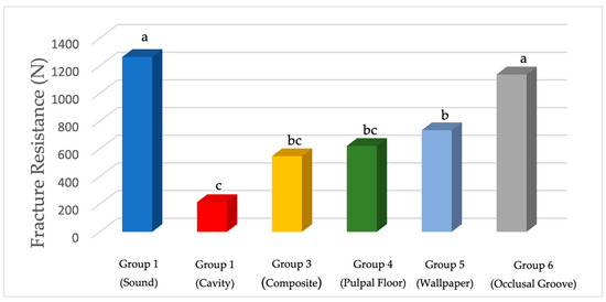 The mean fracture resistance values in Newtons (N). Lower-case letters indicate significance between tested groups.