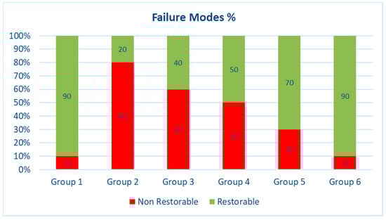 Failure modes (%) of the different groups used in the study (Group 1, sound; Group 2, cavity; Group 3, composite; Group 4, pulpal floor; Group 5, wallpaper; Group 6, occlusal groove.
