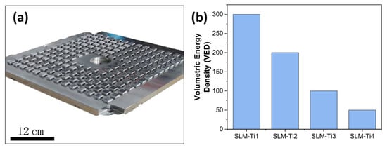 A custom sample holder (Figure 1a) was designed to fit samples measuring 10 mm × 10 mm × 5 mm while keeping all manufacturing conditions constant, except for varying the laser scanning speeds. Four types of SLM samples (SLM-Ti1, SLM-Ti2, SLM-Ti3, and SLM-Ti4) were prepared at varying VEDs (as shown in Figure 1b) by altering the laser scanning speed between 240 mm/s and 1.200 mm/s at a constant laser power of 350 W.