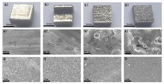 Conversely, a lower VED produces a shallower and broader melt pool and sluggish melt flow, which leads to insufficient fusion between the TiAl6V4 particles and inter-layer adhesion, thus increasing the porosity. Unmelted TiAl6V4 particles can be observed in the SEM images of SLM-Ti2 prepared at a VED of 200 W·mm3/s (as shown by arrows in Figure 2f). SLM-Ti3, prepared at a VED of 100 W·mm3/s, shows an increasingly rough surface with more defects and unmelted particles (as shown by arrows in Figure 2g) due to a gradual decrease in the absorbed laser energy. As illustrated in the SEM image of SLM-Ti4, the lowest VED value of 50 W·mm3/s resulted in insufficient melting (partially melted particles), which caused a lack of fusion, porosity, and rougher surface (as shown by arrows in Figure 2h).