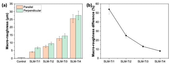 (a) Surface macro-roughness (Ra) values of Ti6Al4V samples fabricated by SLM at varying VEDs, compared to the polished control substrate. Results show a clear increase in surface roughness with higher VED, highlighting the influence of processing parameters on as-built surface morphology. (b) Percentage difference in macro-roughness measured along scanning directions parallel and perpendicular to the laser path for each SLM condition. The results emphasize the anisotropic nature of surface texture formation in SLM due to laser scanning strategy.