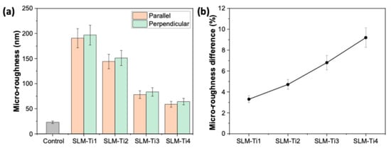 The surface roughness profiles (Ra, arithmetic average of surface roughness) were measured using a profilometer and atomic force microscopy (AFM, WITec, Ulm, Germany). While the profilometer revealed the macro-roughness at a scanning length of 1 mm, AFM analyzed the micro-roughness at a scanning area of 25 µm × 25 µm. The roughness values were measured in two directions: along the laser scan direction and perpendicular to the scan direction.