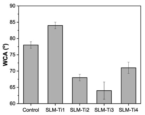Water contact angle (WCA) measurements of Ti6Al4V samples produced via SLM at different VEDs, compared to the control substrate. The results demonstrate that as-built SLM surfaces (except SLM-Ti1) exhibit significantly reduced WCAs relative to the control, indicating enhanced hydrophilicity.
