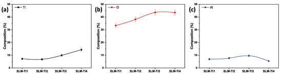 XPS-based surface elemental composition of Ti6Al4V samples fabricated via Selective Laser Melting (SLM) under varying process conditions: (a) titanium (Ti), (b) oxygen (O), and (c) aluminum (Al) content for samples SLM-Ti1 through SLM-Ti4. A gradual increase in surface Ti content is observed with increasing energy input. In contrast, oxygen concentration rises from SLM-Ti1 to SLM-Ti3 and plateaus at SLM-Ti4, likely due to enhanced surface oxidation during laser exposure. Aluminum levels remain relatively stable with slight variation, indicating minimal surface segregation.
