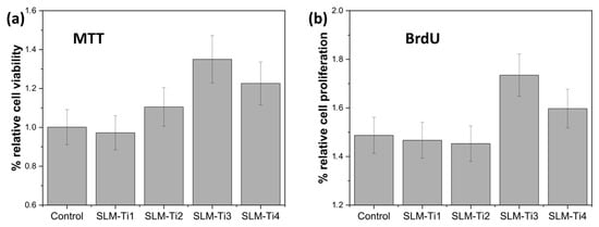 Despite the SLM-Ti2, SLM-Ti3, and SLM-Ti4 samples demonstrating increased cell viability, SLM-Ti3 exhibited a notably superior level of cell viability. Furthermore, to gain deeper insights into the progression of the cell cycle, proliferative activity was measured through BrdU incorporation. Consistent with the MTT assay findings, SLM-Ti4 also showed the highest number of proliferating cells during a 24 h culture period. In contrast, both the control group and samples SLM-Ti1 and SLM-Ti2 displayed comparable levels of cell proliferation. This suggests that SLM-Ti3 and SLM-Ti4 offer an optimal surface topography that enhances the protein adsorption capacity of the surface while promoting cellular behaviors such as initial attachment and proliferation. The enhancement of the cell viability and proliferation on SlM-Ti3 could be attributed to the superior hydrophilicity with respect to other samples. It is important to acknowledge that variations in cell viability and proliferation may also stem from differences in surface chemistry [].