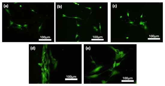 Figure 8 shows fluorescence images of adherent osteoblast-like MG-63 cells cultured on prepared SLM samples. The results showed that the MG-63 cells had a relatively well-attached and spread morphology on both SLM-Ti3 and SLM-Ti4, which is a primary indicator of cell viability. The FDA analysis revealed that there were higher cell counts on both SLM-Ti3 and SLM-Ti4 compared to those on SLM-Ti1, SLM-Ti2, and the control substrate. Notably, there was a pronounced increase in cell numbers, particularly for those cultured on SLM-Ti4 which aligns with the results of the MTT assay shown in Figure 7a. Moreover, in contrast to the other samples, the cells on SLM-Ti3 display an elongated morphology. This phenomenon is likely due to the preferential proliferation and alignment of cells, which seems to be influenced by the melt flows generated during the laser process (Figure 2c). In contrast, osteoblast-like MG-63 cells cultured on SLM-Ti1 and SLM-Ti2 exhibited distinct morphological characteristics. These cells showed limited spreading and a significant decrease in the formation of filopodia-like projections when compared to those grown on SLM-Ti3 and SLM-Ti4.