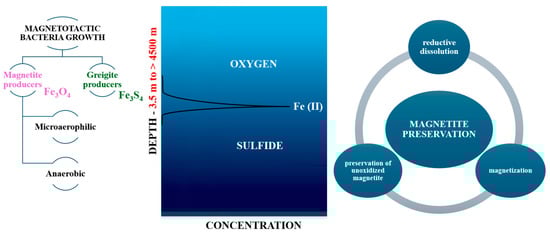 MTB have a ubiquitous distribution; they are found all over the world, on all continents, in fresh, brackish, marine, and hypersaline waters; they develop in sediments or chemically stratified water columns, located at the oxic–anoxic interface (OAI) (Figure 2) [7,10]. Their presence is not dependent on high concentrations of iron in the habitat, but on the presence of an oxic–anoxic interface that generates gradients of oxygen at the surface and reduced compounds in the sediments or in the water column (especially reduced sulfur compounds) [10]; they have increased density variability in different environments and have distinct depth preferences within vertical gradients, and only some strains have a density with close dependency upon the availability of soluble iron [11].