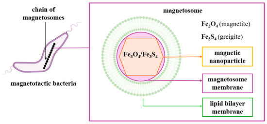 Magnetotactic bacteria convert iron sources into magnetic nanocrystals in the form of magnetite or greigite [4]. MTB produce two types of minerals: iron oxides and iron sulfides. Bacteria that produce iron oxides only biomineralize magnetite (Fe3O4), and those that produce iron sulfides biomineralize greigite (Fe3S4) [6]. They have a lipid bilayer membrane that surrounds the nanoparticle core, forming the organelle called the magnetosome. The magnetosome is a distinctive feature of magnetotactic bacteria from other prokaryotic organisms [6] (Figure 3).