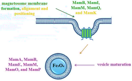 Magnetosome biogenesis includes four successive stages: the invagination of the cytoplasmic membrane, the sorting of magnetosome proteins on the membrane, the transport of iron in the invaginated membrane and mineralization in the form of magnetic crystals, respectively, the assembly of the magnetosome chain (Figure 4) [13,14]. Following the analysis of the MTB genome, the genes responsible for the formation of magnetosomes were identified, and following the proteomic analysis of the translated gene products, they were grouped into four classes of conserved genes. They were clustered in a hypervariable region called the magnetosomal island (MAI) [15].