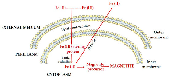 Schematic representation of iron biomineralization in magnetotactic bacteria; uptake of iron from the external environment and conversion into magnetite crystals.