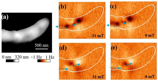 Images of the bacterium Magnetospirillum gryphiswaldense MSR-1 obtained by AFM (a) and MFM (b–e); blue lines indicate the direction of magnetization of the magnetosome chain. Reprinted from Ref. [45].