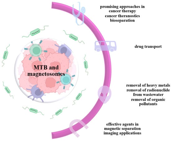 An increasing number of studies consider magnetotactic bacteria for their use in the generation of biofunctionalized magnetic nanotubes and nanoparticles. By modifying the membrane surface, magnetosomes can be functionalized either by chemical modification in a dispersed state, or by genetic manipulation of the MM proteins. In this way, macromolecules such as proteins, peptides, or DNA can be functionalized with magnetosomes, thus opening a varied spectrum of possibilities for the use of MTB [95]. These properties give MTB the necessary characteristics to be used in several biomedical applications (Figure 12): drug carriers, hyperthermia treatments [96], contrast enhancers in magnetic resonance imaging [97], and the removal of heavy metals and radionuclides from wastewater by magnetic separation [98].