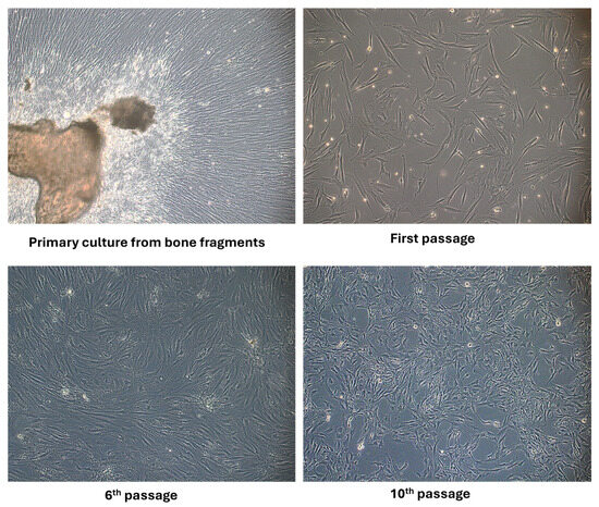 Applying the mechanical and enzymatic processing protocol, the appearance of the first migrated cells to the periphery of the bone fragments was observed in the primary culture after 4–7 days. The first passage was performed after 14 days, when confluence was around 60–70%. After two to three passages, the proliferation rate was increased and a more homogenous fibroblastoid-like shape resembled pre-osteoblasts at passage 6. By applying an osteogenic cultivation medium containing ascorbic acid, β-glycerophosphate and dexamethasone, the cells’ morphology changed, namely smaller dimensions, a more retracted cell body and more prominent nuclei, as seen at passage 10 in Figure 1. The literature describes protocols that also use the method without enzymatic digestion but emphasize certain cultivation conditions. To obtain a pure osteoblast culture, it seems that collagenase treatment is a necessary step to avoid contamination with bone marrow-derived cells. Supplementation of the cultivation medium with ascorbic acid is beneficial for both osteoblast isolation and for collagen’s normal synthesis and secretion by osteoblast cells [27]. Other authors have reported that spontaneous isolation is also possible by defining osteoblasts with specific markers such as Bone Morphogenetic Protein-2,4 collagen type I and ALP activity. They found that the time needed in primary cultures to reach confluence depended on the age of the donors and on the method of cell harvesting, an advantage being aged under 65 years old and using the collagenase isolation method [28].