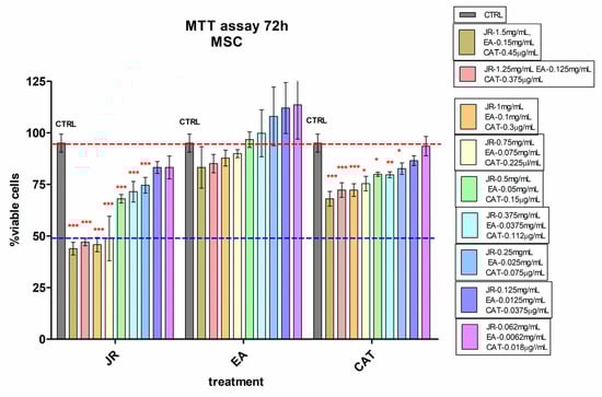 MTT viability test of adult mesenchymal cells (MSCs) from bone marrow, treated for 72 h with walnut leaf extract (JR), ellagic acid (EA) and catechin (CAT). Error bars represent the standard deviations of three separate measurements (n = 3). Two-way ANOVA followed by the Bonferroni post test was used for comparison of different treated groups with untreated control cells; * p < 0.05, ** p < 0.01 and *** p < 0.001.