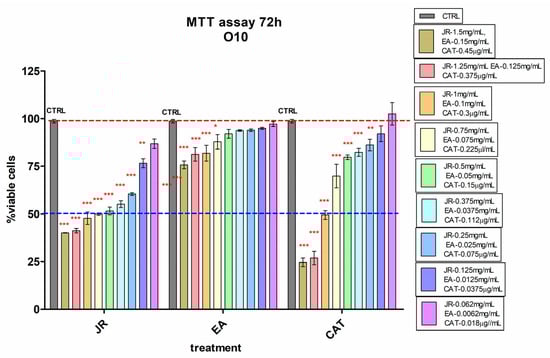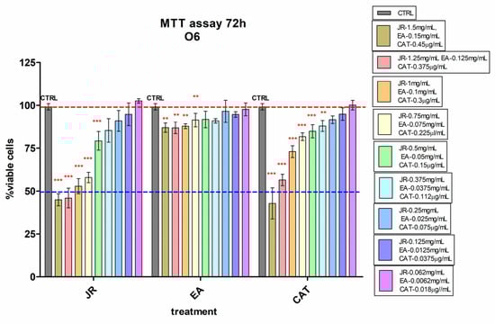 The effects of JR extract, EA and CAT on MSC, O6 and O10 cultured for 72 h in the presence of the treatments were assessed by using the cell viability test, MTT. The obtained results for MSCs are illustrated in Figure 2. High cytotoxicity was observed at doses between 1.5 mg mL−1 and 0.75 mg mL−1 of JR extract, with a percentage reduction in viable cells below 50% compared to the control untreated cells. The effects of EA were at the level of the untreated control values. CAT induced a cytotoxic effect of about 30% inhibition at higher doses from 1.5 mg mL−1 to 0.75 mg mL−1 (Figure 2).