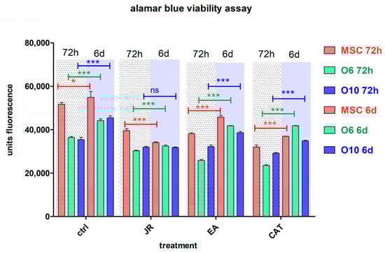 The fluorescence values emitted by cells in the alamarBlue test under the influence of two treatments with JR extract (0.5 mg mL−1), EA (0.05 mg mL−1) and CAT (0.15 µg mL−1). The determinations were made at 3 and 6 days of cultivation after the two treatments. For multiple comparisons for each cell line of controls and treatments responses, two-way ANOVA analysis followed by the Bonferroni post test was performed, estimating the differences between values obtained at 72 h with those at 6 days. Error bars represent the standard deviations of measurements (n = 4). ns p > 0.5, * p < 0.05 and *** p < 0.001.