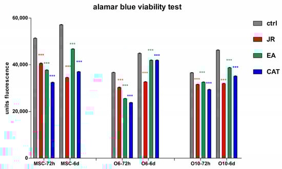 The results obtained in the MTT viability test enabled us to select a common dilution (×26.6) for the three treatments that would not be cytotoxic and that at the same time would exert effects on the osteogenesis process. The used concentrations were as follows: JR—0.5 mg mL−1, EA—0.05 mg mL−1 and CAT—0.15 µg mL−1. In the experiment using the alamarBlue test, this dose on cells cultured for a longer period of up to 6 days was followed with the administration of two treatments at 24 h and 3 days. The rationale for using a single dose for the three treatments derived from the viability assays was the observation of differences in the induction of bone differentiation of the three cell lines at different stages of maturity, in a manner similar to what occurs in a whole organism. This can be considered a limitation of this study, determined by the intention of simplification for the interpretation of the results.