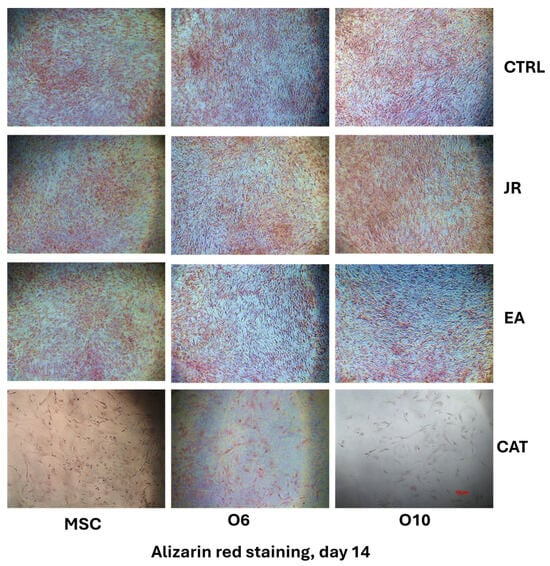 The differences in behavior between the different stages of osteoblastic cell differentiation were also assessed by alizarin red staining. More visible staining of the differentiated control cells O6 and O10 was noticed compared to the adult MSCs. JR extract and EA induced slightly more distinct mineralization for pre-differentiated cells, while CAT had a cytotoxic effect at this dose.