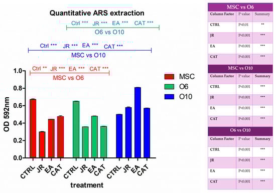 Alizarin red staining was performed for all three cell lines to observe the differences in behavior between the different stages of differentiation of osteoblastic cells: MSC, O6 and O10. They were seeded in plates with 24 wells with a cell density of 5 × 104 cells/well in 1 mL/well of OS differentiation medium. The cells were cultured for 14 days, and 4 treatments were performed with the same dose of JR, EA and CAT (dilution × 26.6). At the end of cultivation, the cells were fixed with 4% paraformaldehyde for 20 min and washed three times with PBS, then with double-distilled water. Exposure of 20 min to 2% alizarin red solution (pH 4.2) was applied with gentle agitation on an orbital shaker. The staining solution was discarded and extensive washes with double-distilled water were performed, with the last wash using PBS. Microscopic images were taken to visualize the calcium deposits under an inverted phase microscope, Zeiss Axiovert D1, using an AxioCAM MRC color camera. Quantification of mineralization was performed with a 10% cetylpyridinium chloride (CPC) solution, a detergent that solubilizes calcium deposits (violet coloration that can be read on a microplate reader at 562 nm). PBS was extracted from the wells, and 10% CPC solution was added, with 15 min incubation on an orbital shaker. Aliquots were extracted into a 96-well plate and readings were performed on a Biotek Synergy2 reader at a wavelength of 562 nm.