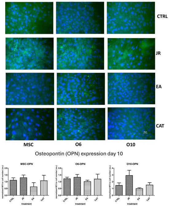 The images in Figure 9 reveal several observations. The control cells expressed OPN with a moderate intensity, but the treatment with JR induced an increase in the fluorescence intensity (the highest for the younger cells—MSC and O6). The effect of EA was the opposite, with the increase in OPN expression in cells occurring in a more mature stage of differentiation. Cells exposed to CAT showed levels very similar to control cells.