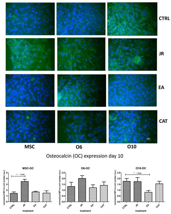 The effect of JR on inducing differentiation towards mature osteoblastic cells was also observed in the staining for the expression of OC. OC is a non-collagen protein that represents approximately 15% of the bone protein matrix. During the process of bone differentiation, OC secretion is very decreased and does not reach maximum levels until the mineralization’s late stages. As shown in Figure 10, the untreated control cells expressed different levels of OC, the most intense being for the most advanced differentiated cells O10. JR extract substantially increased OC expression in MSCs, but also in O6 and O10 osteoblasts. EA augmented the production of OC, especially by younger osteoblasts O6, but also by MSCs, and inhibited OC expression in O10 cells. CAT amplified the expression of OC by MSCs and inhibited its expression by mature osteoblastic cells O6 and O10.
