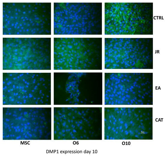 A similar effect was observed when staining for DMP1 (FITC). DMP1 is a critical protein for the proper mineralization process of bone and dentin; it is present in various cells of bone and dental tissues. In undifferentiated osteoblasts, it is primarily a nuclear protein regulating the expression of osteoblast-specific genes. During osteoblast maturation, the protein becomes phosphorylated and is exported to the extracellular matrix, where it initiates the formation of the mineralized matrix. In Figure 11, the intra-nuclear expression of DMP1 can be seen by young MSCs. This expression was much more intense and localized in the extracellular space for O6 and O10 cells, where the mineralization process was much more advanced. The effect of JR extract increases the synthesis of DMP1 by MSCs, with protein accumulation in the extracellular space. Mature O10 osteoblastic cells presented a slight decrease in DMP1 expression compared to the untreated control. EA acted only on young MSCs and induced a decrease in expression by mature cells. CAT also inhibited the expression of DMP1 in mature osteoblast lines.