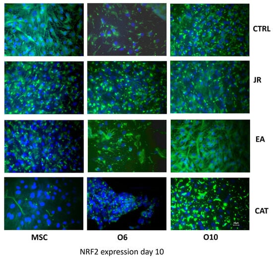 To evaluate the protection-inducing effects of JR extract, EA and CAT against exogenous factors, especially against oxidative stress, immunocytochemical staining was employed to evaluate the expression of the NRF2 protein/transcription factor. It seems that the stage of osteogenic maturation also determined different expressions of NRF2, with the most intense expression found for mature O10 cells and the lowest level for O6 cells. Both JR extract and EA determined a significant increase in this protein in all three cell lines, meanwhile CAT inhibited the expression of NRF2 by MSCs (Figure 12).