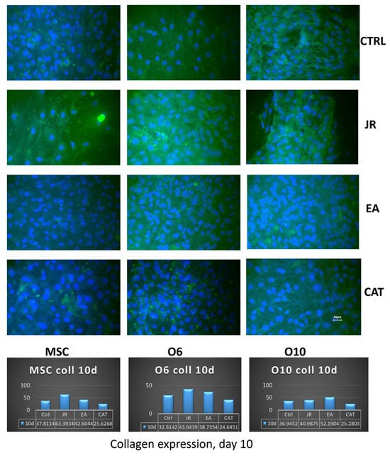 The expression of collagen 1A was investigated in parallel with collagen dosing from the supernatants after 10 days of cultivation of the three cell lines in osteogenic medium and after the application of three treatments with JR, EA and CAT performed at each medium change. Collagen was expressed intracellularly and partially extracellularly by MSCs, and this expression increased in more mature osteoblasts (O6 and O10). In immunocytochemical staining, this expression was detected in untreated cells, more intense in the case of O10 cells. JR extract increased collagen expression in the supernatants after 10 days of cultivation which were collected from MSC cultures (average 63 μg mL−1) and to a lesser extent from O6 (average 43.6 μg mL−1) and O10 cells (average 40.9 μg mL−1). The effect of EA was demonstrated especially in mature osteoblasts (O10), with increased collagen expression both intracellularly and in the supernatants (average 52 μg mL−1). CAT had an effect of increasing intracellular expression only in O6 osteoblasts, but in the supernatants the level decreased for all three cell lines at a level of around 25 μg mL−1 (Figure 13).
