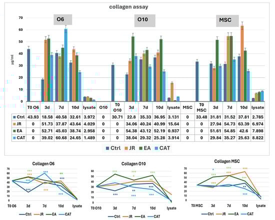 Collagen levels (µg mL−1) at time 0 and at 3, 7 and 10 days in the supernatants of MSC, O6 and O10 cell cultures in osteogenic medium and after 3 treatments with JR extract (0.5 mg mL−1), EA (0.05 mg mL−1) and CAT (0.15 µg mL−1). The cellular lysate was harvested 10 days after the culture. The values are expressed in µg mL−1. Error bars represent the standard deviations of three measurements (n = 3). One-way ANOVA followed by the Bonferroni post test demonstrating the statistically significant effects for each cell line in response to JR, EA and CAT treatments compared to control samples is illustrated in the bottom panel. The p-values are set at * p < 0.05, ** p < 0.01, or *** p < 0.001.
